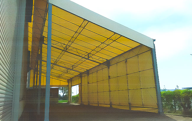 柱の下にキャスターを付けており開閉・移動が可能なので、確認申請が不要な場合があります。テントとしても機動性を持つことで、作業空間をより有効に活用できます。開閉式テントなどと組み合わせることにより、用途が大きく広がります。