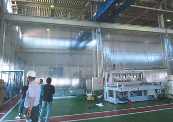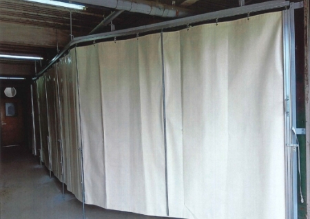 工場内をカーテン式テントで分割した事例です。透明な素材を使っていますので見通しがきき、なおかつ開閉が楽なので作業に応じて適宜最適なスペースを確保することが可能です。