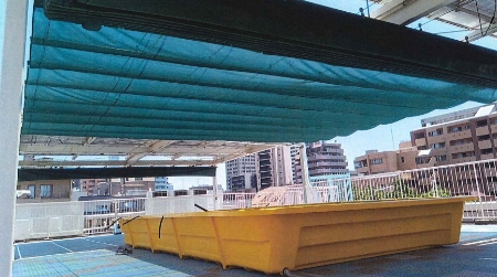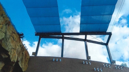 ガラス張りのトップライトは、夏場には室内が非常に暑くなります。メッシュ素材の膜材をガラス面の上に設置して、暑さを軽減する工法です。