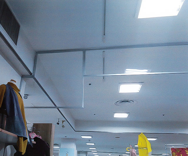 夢工房の防煙垂壁「ウォールキャンバス」は、通常ガラスが使われている部分防煙垂壁を不燃材シートにすることで軽量化をはかり、落下の際の被害を軽減。多数の商業施設でご採用いただいています。