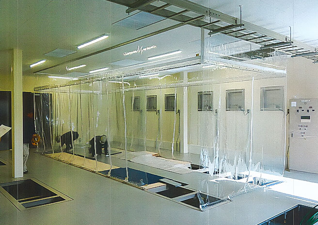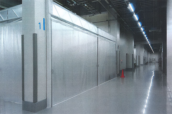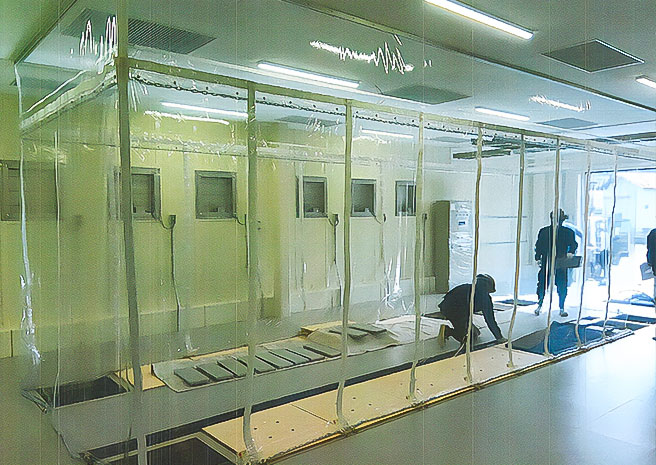 工場内をカーテン式テントで分割した事例です。透明な素材を使っていますので見通しがきき、なおかつ開閉が楽なので作業に応じて適宜最適なスペースを確保することが可能です。