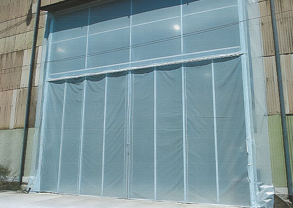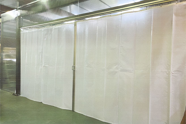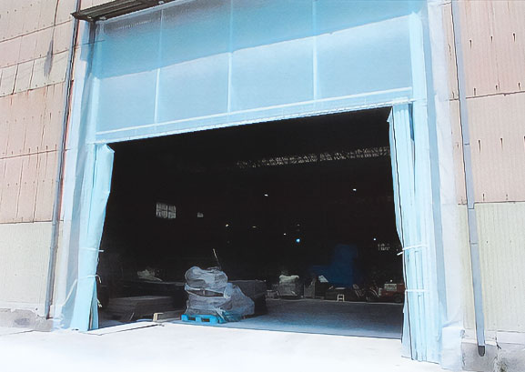 工場などの大きな空間を仕切ってスペースを作ります。固定的な部屋を作るよりも低コストで、スペースを最適な大きさにすることで空調 の効率化もはかれます。簡易的な風除室としても活用されています。